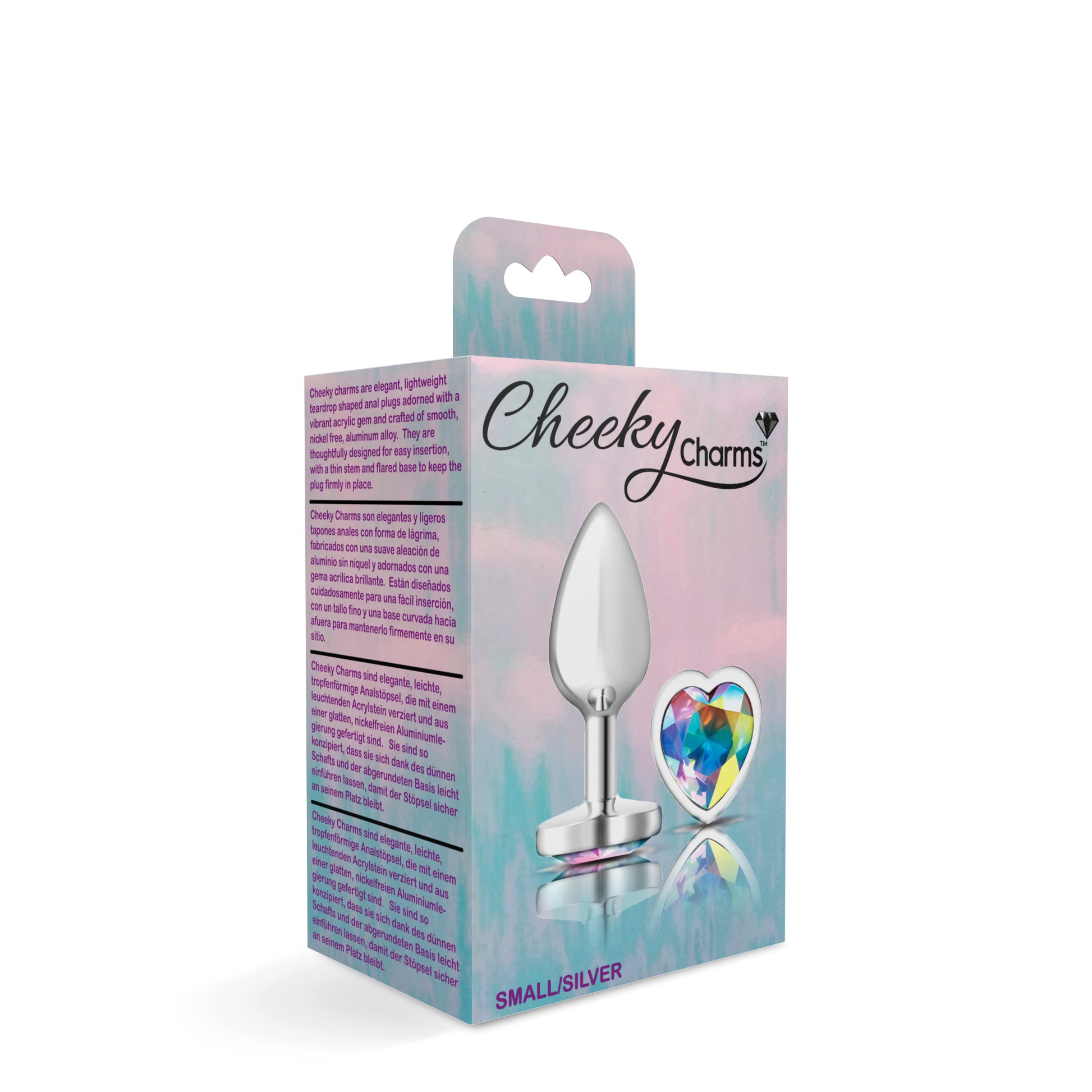 Small, silver metal, teardrop shaped anal plug with sparkling clear iridescent colored, heart shaped acrylic gemstone. Hypoallergenic, nonporous, body safe, nickel free, aluminum alloy, anal jewelry compatible with all lubricants. Easy to clean and dishwasher safe butt plugs.