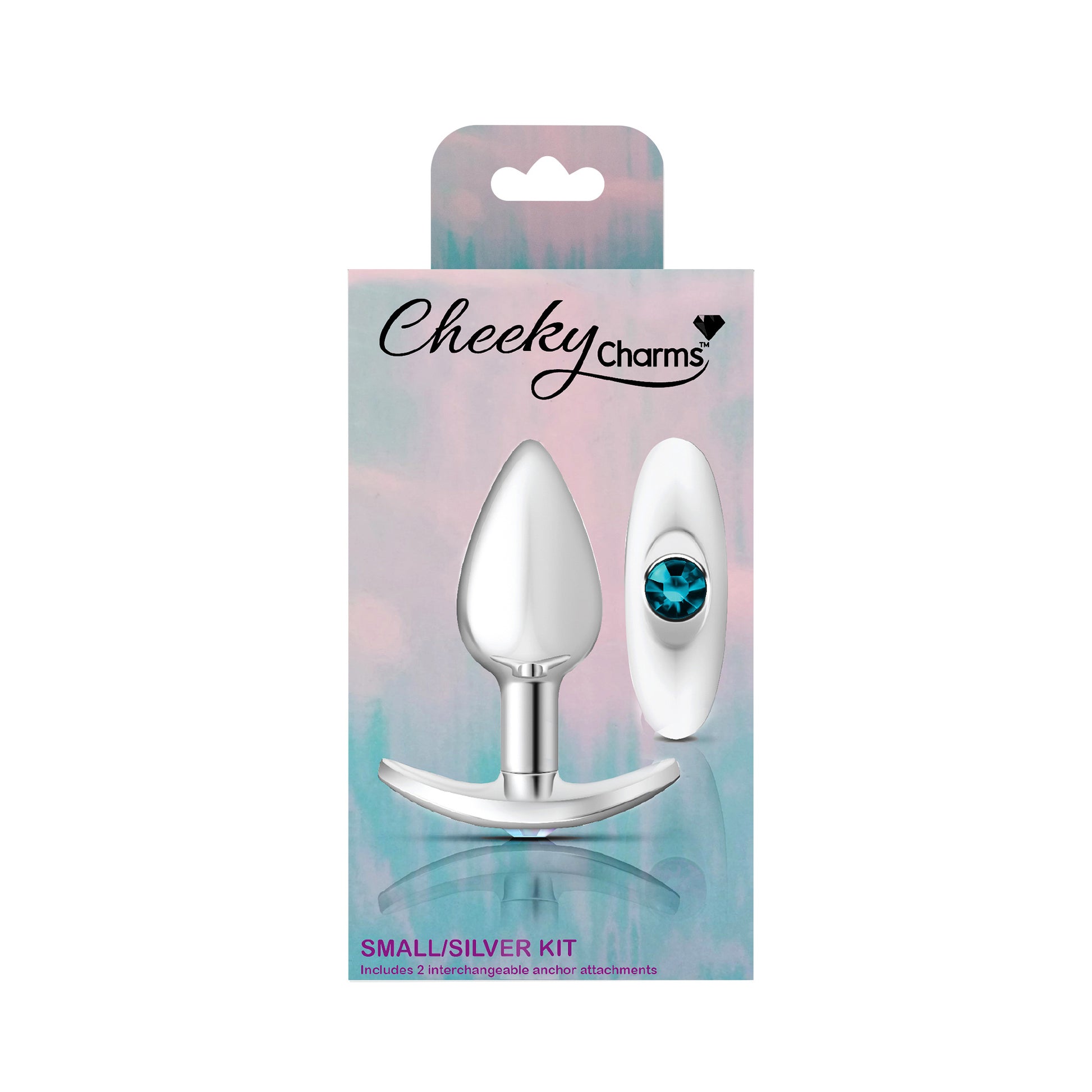 Cheeky Charms Anchor Kit offers a seductive metal teardrop shaped anal plug with two interchangeable anchor bases, each showcasing a beautiful acrylic gemstone. These butt plugs are great for temperature play and anyone who wants to decorate their rear entrance. Tapered for easy insertion and designed with an anchor base and thin stem, this kit is the perfect accessory for any occasion or fantasy. Cheeky Charms anal plugs are comfortable to wear for an extended period of time. Wearable during intercourse to achieve a fuller feeling. Kits include an anal plug with two anchors in both kit options. One clear iridescent gemstone anchor base is included in both kits along with the choice of either a bright pink or teal blue base for the second anchor option. Cheeky Charms Anchor Kits are the perfect booty jewelry for women, men, couples and also for solo play.